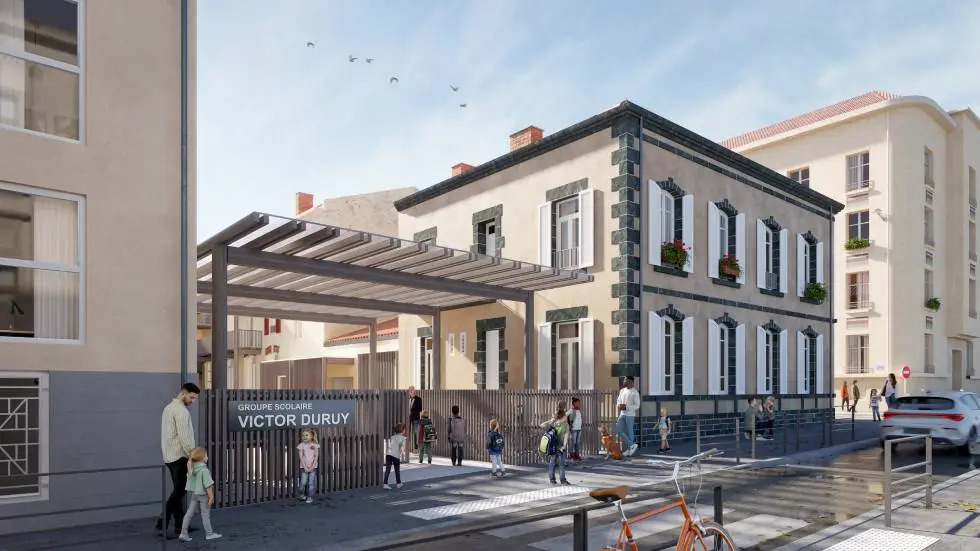 Sous mentorat de l’agence MTA Architectes, nous avons conçu la réhabilitation d’une école clermontoise. Il s’agissait de retravailler l’entièreté de locaux dans un contexte de conception / réalisation en site occupé. Le parti que nous avons pris qui a valu le lauréat à MTA à été d’externaliser les circulation en proposant une coursive extérieure.