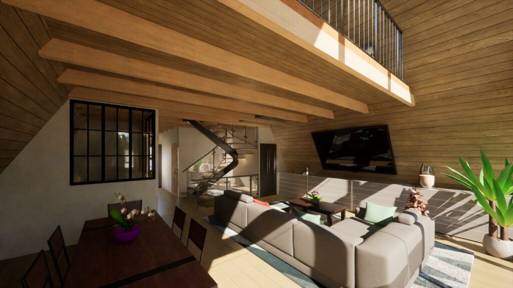 Approché par le client dans l’idée de créer une maison ou la charpente est omniprésente, nous avons conçu ensemble ce projet ou la maison est une charpente !